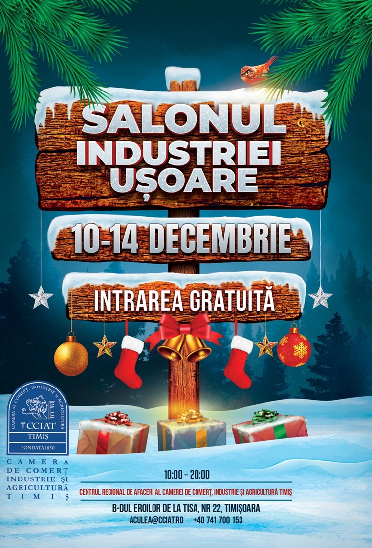 În perioada 10– 14 decembrie, Centrul Regional de Afaceri al CCIA Timiș (Timișoara, Bd. Eroilor de la Tisa nr.22), găzduiește ultima ediție din acest an a SALONULUI INDUSTRIEI UȘOARE, dedicată sărbătorilor de iarnă.